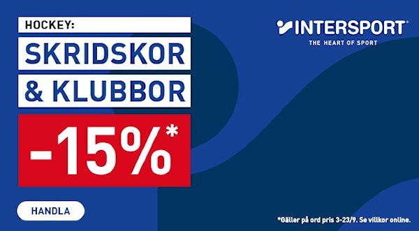 Den 3–23/9 har vår samarbetspartner Intersport 15% rabatt på skridskor och hockeyklubbor i butik eller på intersport.se. Ett perfekt läge att köpa det ni behöver för hockeyn. Gäller för dig som är eller blir medlem i Club INTERSPORT.